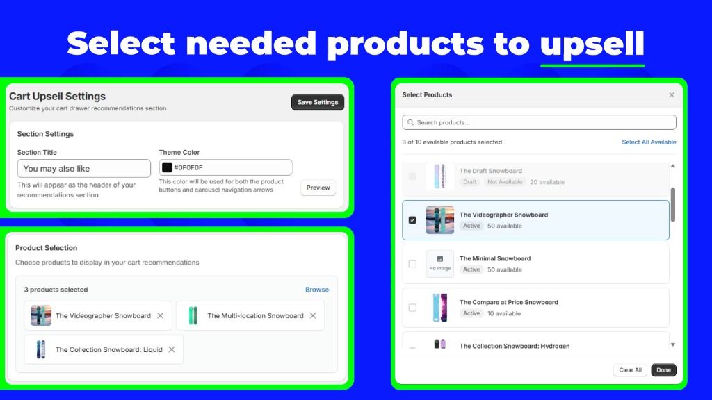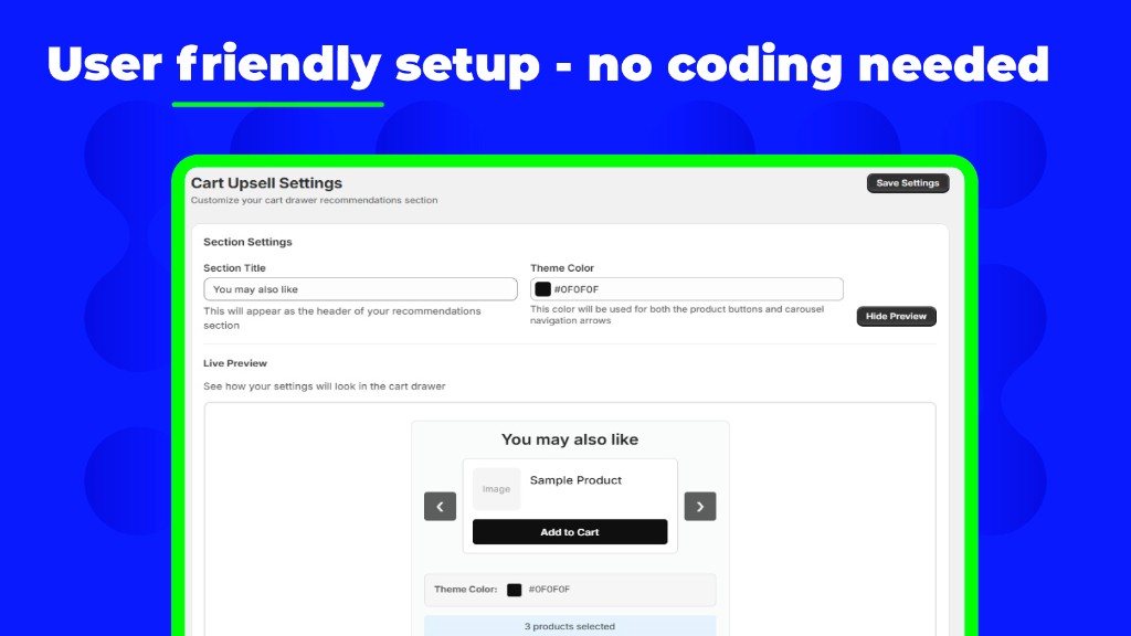 Grow your revenue with smart cart upsells. Our app integrates directly into your Shopify cart drawer, displays personalized product recommendations, and lets customers add items with one click. Customize the title, theme colors, and product selection—no coding required. User-friendly setup in minutes.